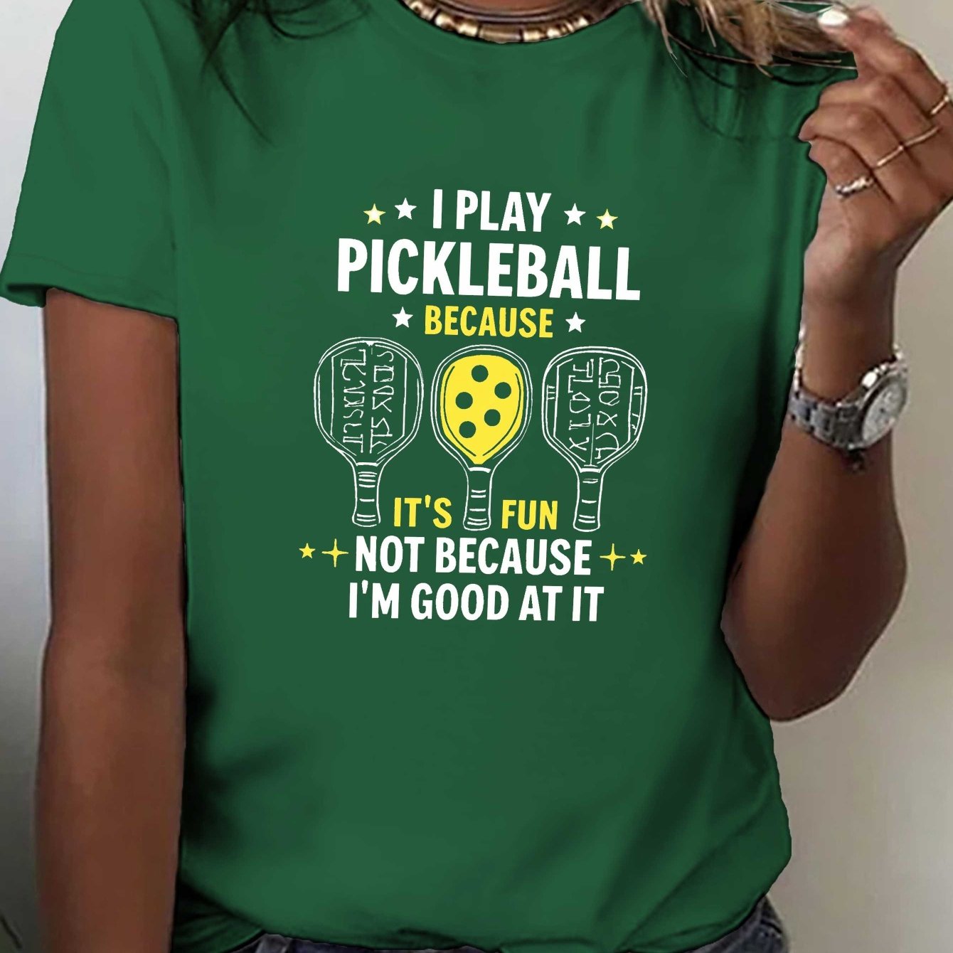 Pickleball Fun Quote Paddles Print T-shirt, Short Sleeve Crew Neck Casual Top for Summer & Spring, Women's Clothing